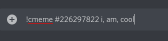 Syntax for !cmeme: !cmeme <id> <arg1>, <arg2>, <arg3>, <arg4>, ...